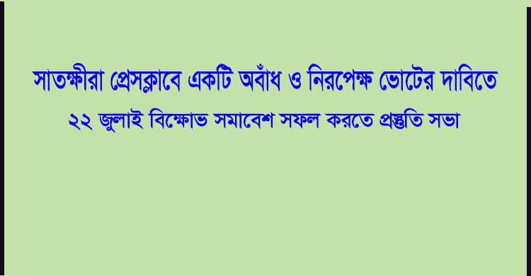 সাতক্ষীরা প্রেসক্লাবে একটি অবাঁধ ও নিরপেক্ষ ভোটের দাবিতে চলমান আন্দোলনের অংশ হিসেবে আগামী ২২ জুলাই মঙ্গলবার বিক্ষোভ সমাবেশ উপলক্ষে এক