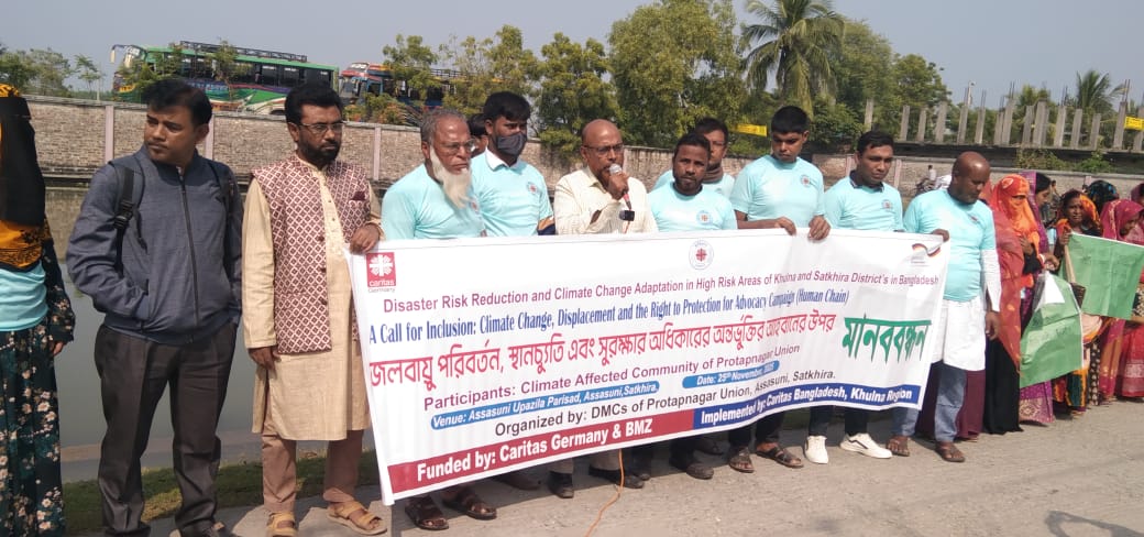 আশাশুনিতে টেঁকসই বেড়িবাঁধ ও জলবায়ু পরিবর্তন, স্থানচ্যুতি এবং সুরক্ষা অধিকারের অন্তর্ভুক্তির দাবিতে মানববন্ধন